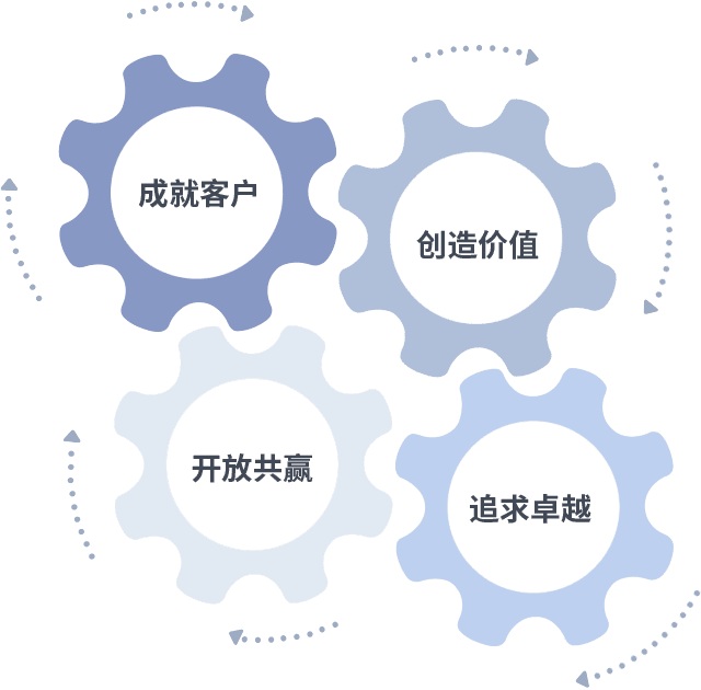 成就客户是一切决策的出发点,,,创造价值是衡量所有工作的标准,,,追求卓越是我们做事做人的态度,,开放共赢是我们的格局也是最终的结果。。。。价值观的齿轮环环相扣,,,推动着组织里的每个人不断向前。。。